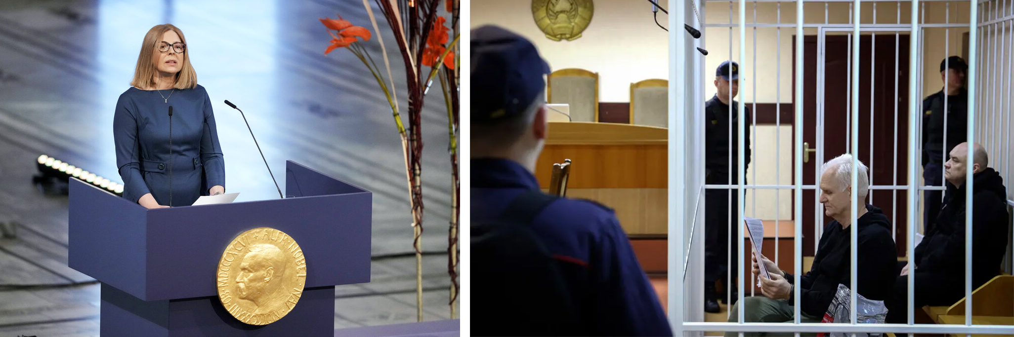 Natallja Pintjuk, hustru till Nobels fredspristagare Ales Bjaljatski, talar under Nobels fredsprisceremoni i Oslo den 10 december 2022. Årets fredspris delades mellan den fängslade belarusiske människorättsaktivisten Ales Bialiatski, den ryska organisationen Memorial och Center for Civil Liberties i Ukraina. Foto Markus Schreiber. Nästa bild: Ales Bjaljatski i mitten vid en domstolsförhandling i Minsk 2023. Foto Vitaly Pivovarchyk/BelTA via Associated Press.