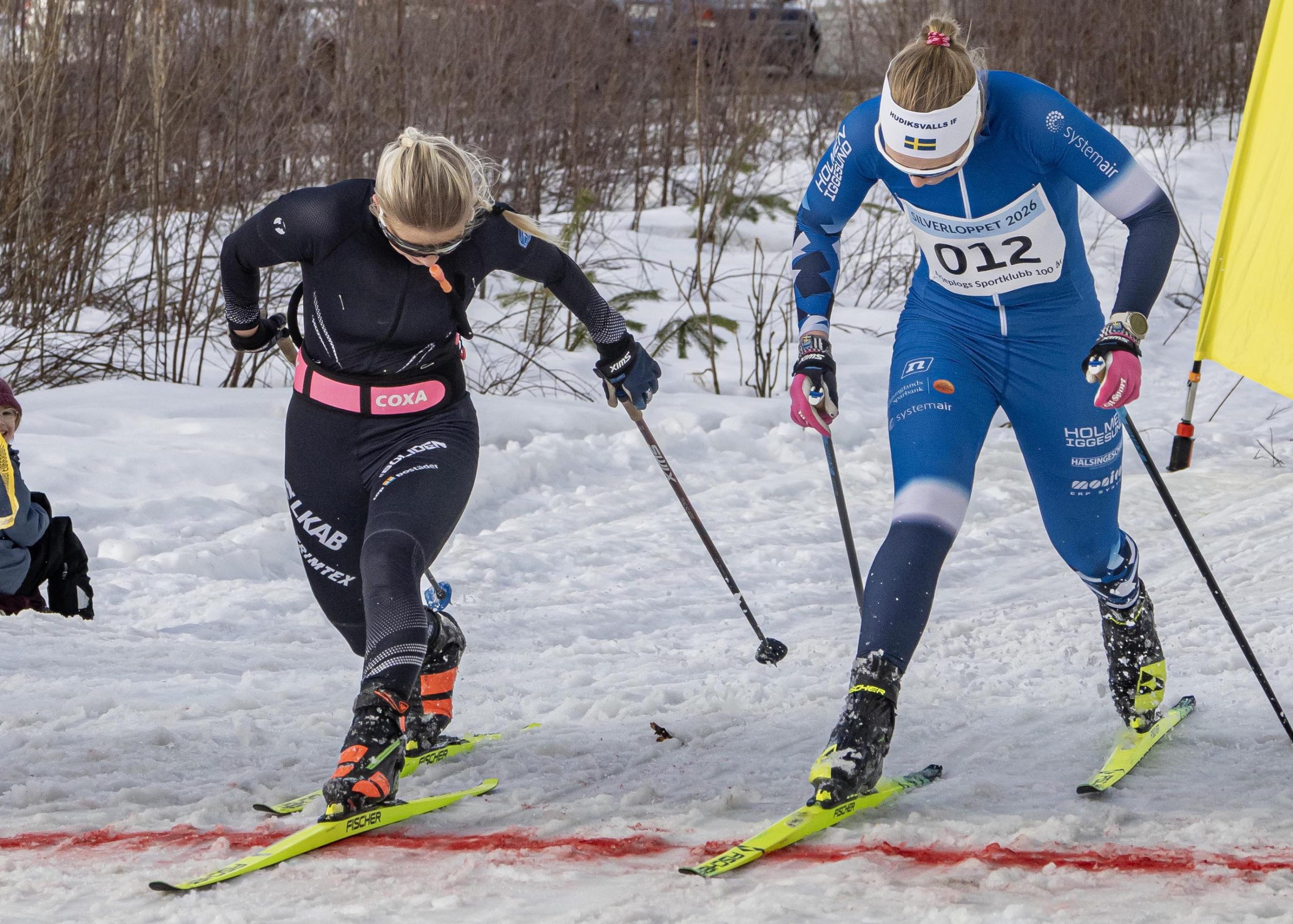 Slutspurt ända in i mållinjen. Emma Antonsen, Gellivare Skidallians IK, vann mot Ebba Holmgren från Arjeplog, men som tävlar för Hudiksvalls IF. Foto Sofie Abrahamsson (Klicka på bildrutan om foto inte syns).